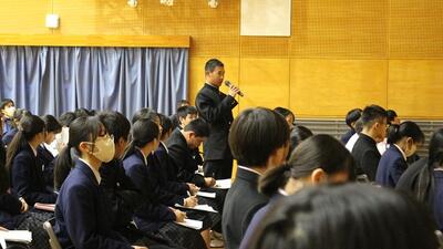 総合的な学習の時間 発表会 投稿: 編集長 (09:07) 令和7年12月16日 火曜日 5時間目・6時間目は総合的な学習 3年生の各グループが実施してきた 「貢献」について体育館で発表がありました。 フロアーの生徒から積極的な発言がありました。 -