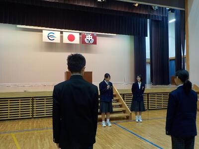 卓球部 広島県新人戦 壮行式 投稿: 編集長 (01/28) カテゴリー: クラブ活動 令和8年1月27日 火曜日 卓球部 広島県新人戦に参加する生徒の壮行式をおこないました。 生徒からは日頃の練習の成果を発揮して、スマッシュを決めたいと 決意を表明しています。 -
